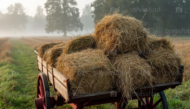 Сено в тележке на поле летом, сельский ландшафт