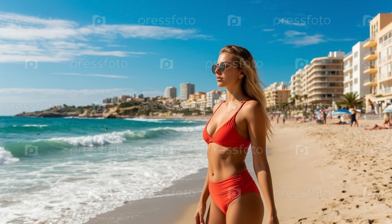 Портрет красивой девушки в купальнике на городском пляже в курортном городе