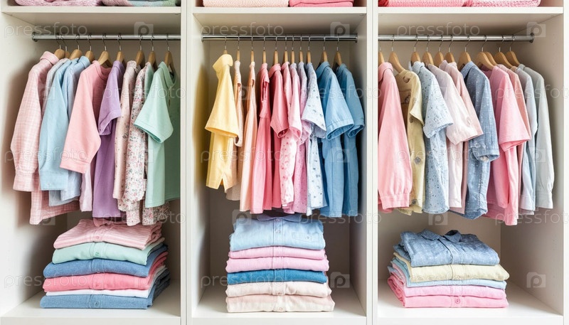 Детская одежда сложена в белом шкафу
