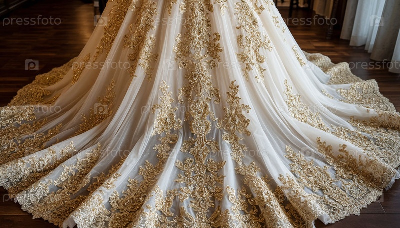 Свадебное платье из кружева и золотой вышивки