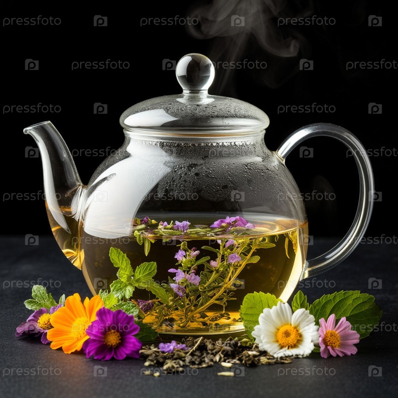 Стеклянный чайник с цветочным чаем на черном фоне