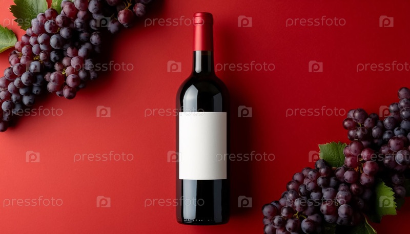 Бутылка вина с пустой этикеткой на красном фоне, компоновка