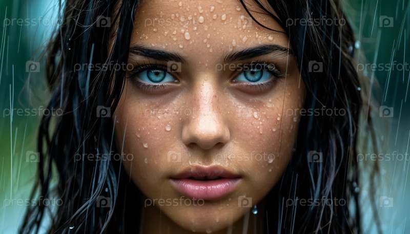 Большой портрет красивой брюнетки с серо-синими глазами под дождем