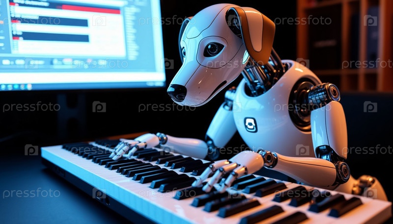 Робот-собака играет на цифровой фортепианной клавиатуре