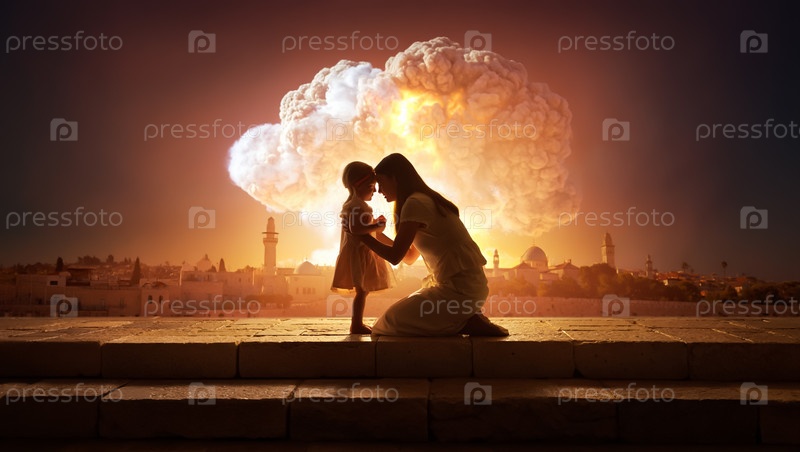 Мать с ребенком на фоне ядерного взрыва над ближневосточным городом