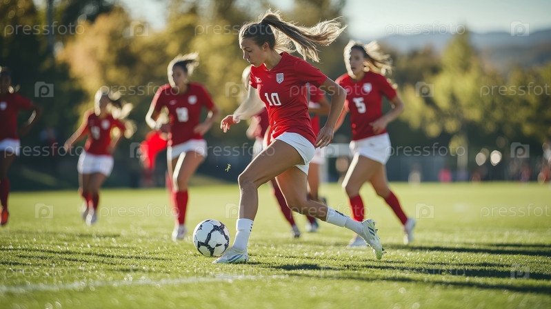 Футболисты в красной форме энергично соревнуются на ярко-зеленом поле