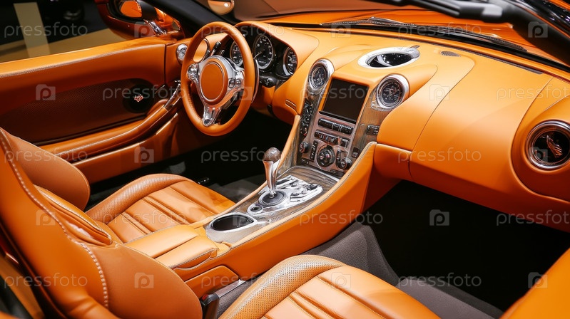 Роскошный коричневый кожаной интерьер высококлассного спортивного автомобиля