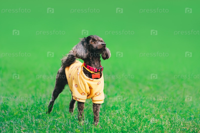Маленькая пожилая собака в оранжево-жёлтой куртке с капюшоном и воротничке с костной тегкой стоит на траве и смотрит вверх, фотография со свободным местом для текста. старшая маленькая собачка в оранжевой желтой свитер и воротник с костной тегой стоит на