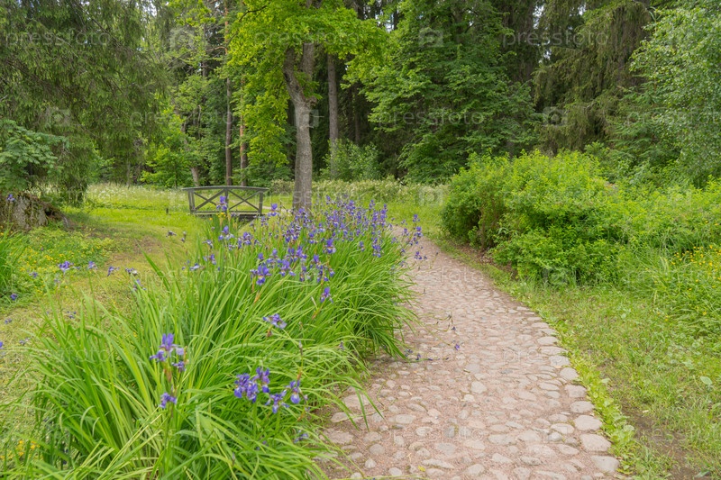 Каменный путь через китайскую долину с мостами и растениями, радугами