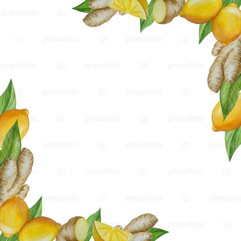 Акварельная иллюстрация пряностей имбиря, половины, листья и ломтики. Ручно нарисованная иллюстрация выделена на белом фоне. Корень имбиря для дизайна продуктов питания. Кухонная трава и специи
