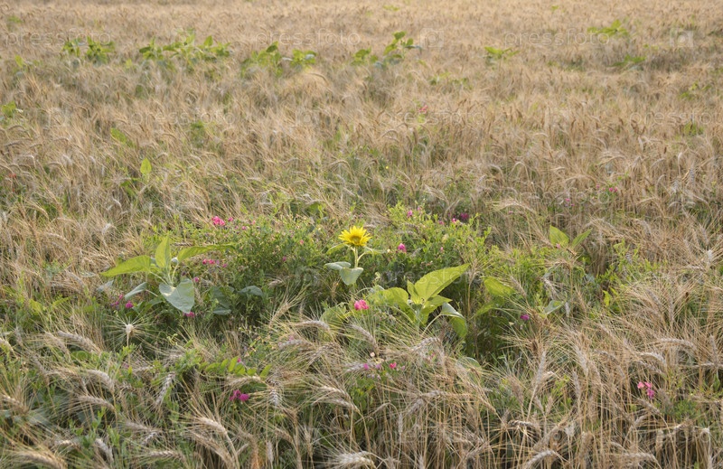 Красивый подсолнечник с нежными желтыми лепестками среди пшеничного поля созревания