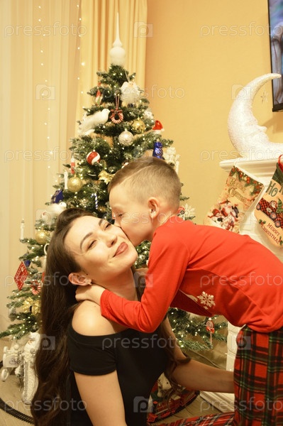 Женщина и мальчик сидят на полу перед украшенной рождественской елкой. На дереве светились гирлянды, орнаменты и пузыри. Уют и радость семейных праздников
