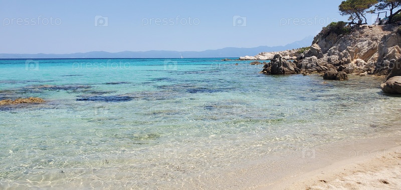 Дикий пляж у моря, чистый и мягкий песок, чистая вода и большие камни, отдых на море или океане, летние каникулы или путешествия