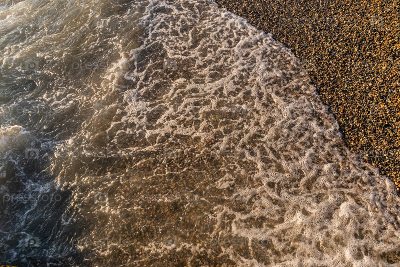 Мягкая волна распространяется на галечный пляж. морское побережье с маленьким галькой прекрасно видно сверху. искрящие лучи солнца в воде