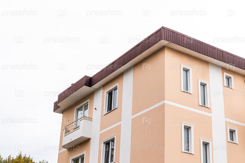 Уголок стильного бежевого дома с современным белым декором и узкими окнами. фрагмент последних этажей дома. городская архитектура