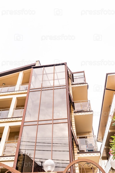 Современное городское здание с большими стеклянными окнами, стильный балкон. вид сверху. архитектурные детали дома. вертикальный взгляд