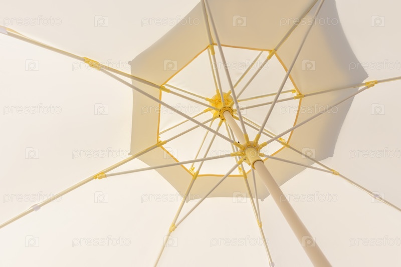 большой открытый зонтик бежевого цвета. зонтик для защиты от яркого солнца на пляже, кафе, внутреннем дворе, террасе. реалистичные фотографии