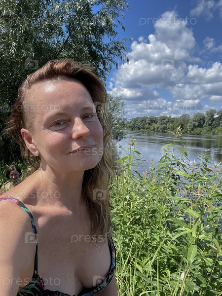 Летом у реки стоит женщина в купальнике с длинными волосами