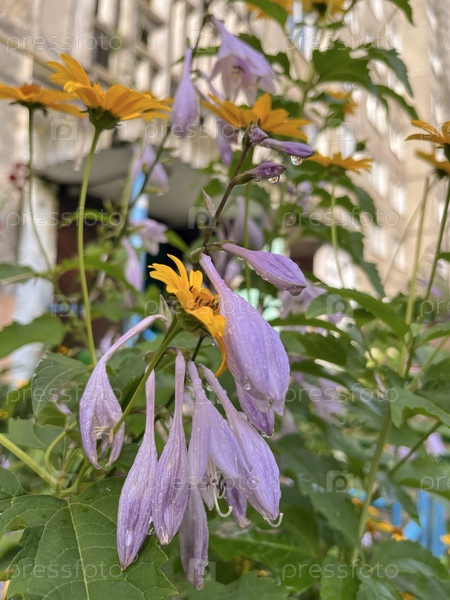 Летом в городе возле въезда в жилое здание цветет ланцелатный хозяин