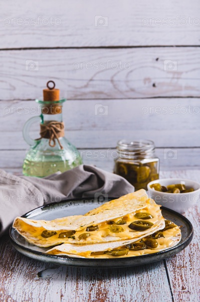 Острые квесадиллы с сыром и перцем халапено на тарелке на столе вертикальный вид