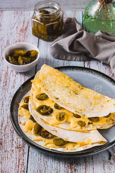 Сыр и халапено Мексиканские квесадиллы на тарелке На столе вертикальный вид
