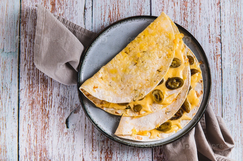 Покройте острый квесадиллу с сыром и перцем халапено на тарелке на столе наверху