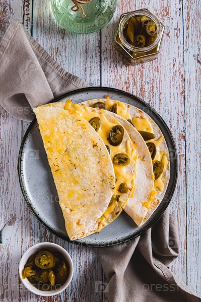 Сыр и халапено Мексиканские квесадиллы на тарелке на столе и вертикальный вид