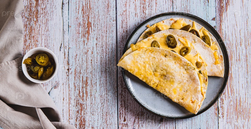 Сыр и халапено Мексиканские квесадиллы на тарелке на столе с видом на веб-баннер