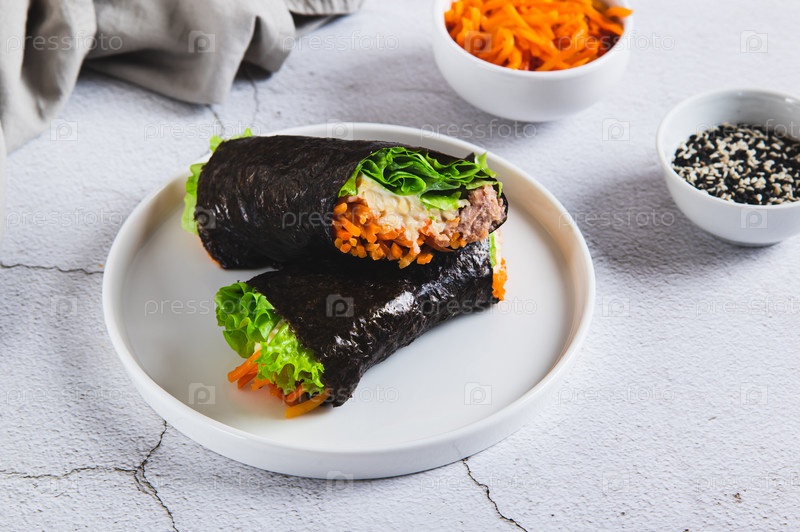 Рулоны с тунцом, корейскими морковью, салатом и соусом на тарелке за столом