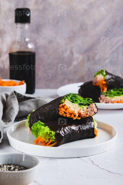 Тунец, сыр, корейские морковь и салат упакованные в нори на тарелке на столе вертикальный вид