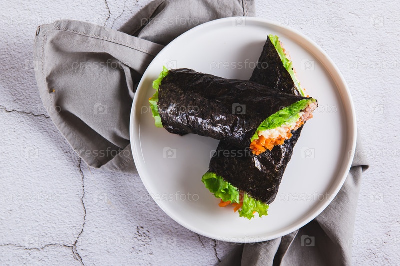 Тунец, сыр, корейские морковь и салат завернуты в нори на красивых тарелках
