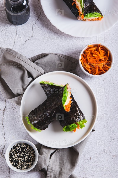 Рулоны с тунцом, корейскими морковью, салатом и соусом на тарелке за столом и вертикальным видом