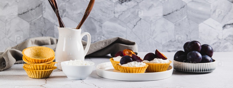 Мини торты с творогом и сливами на тарелке за столом