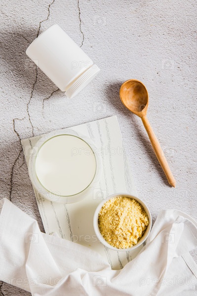 Коровье молочно-сосудистое порошок в миске и разбавленный напиток в стакане на столе и вертикально