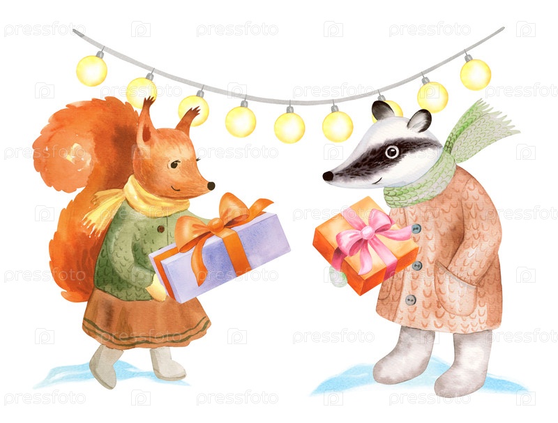 Белка и барсук обмениваются подарками. Иллюстрация акварели. Для ткани, обоев, упаковочной бумаги, поздравительных открыток, дизайна, декора и иллюстрации