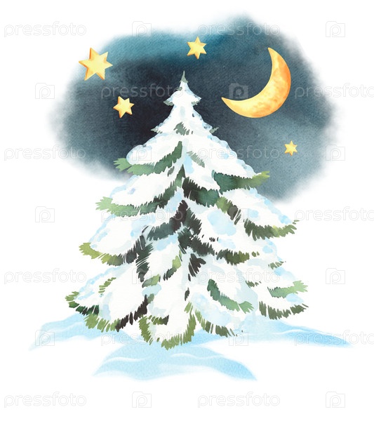 Ела и снег со звездами и луной на фоне. для ткани, обоев, упаковочной бумаги, поздравительных открыток, дизайна, декора и иллюстрации