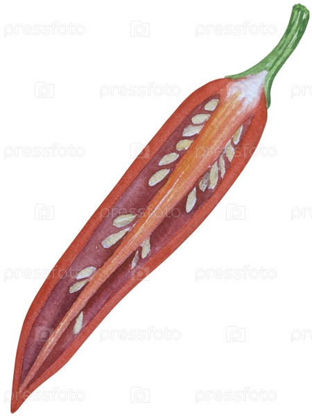 Целые и нарезанные бутылки красного чили выделены на белом фоне. Ботаническая акварель ручной иллюстрации острой овощной культуры с зеленым листьем. Для дизайна упаковки, меню ресторана, кухни