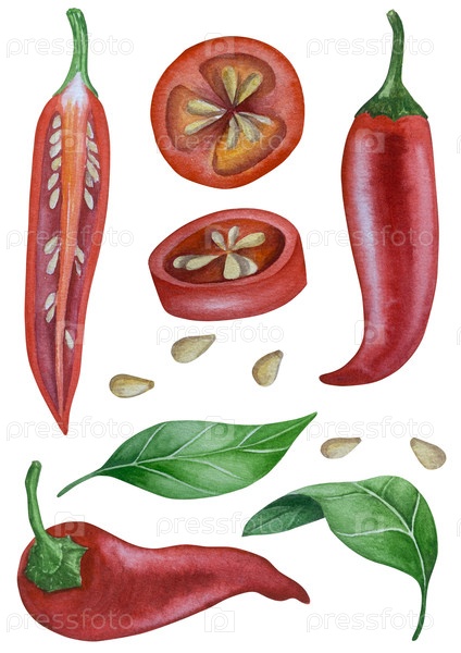 Целые и нарезанные бутылки красного чили выделены на белом фоне. Ботаническая акварель ручной иллюстрации острой овощной культуры с зеленым листьем. Для дизайна упаковки, меню ресторана, кухни