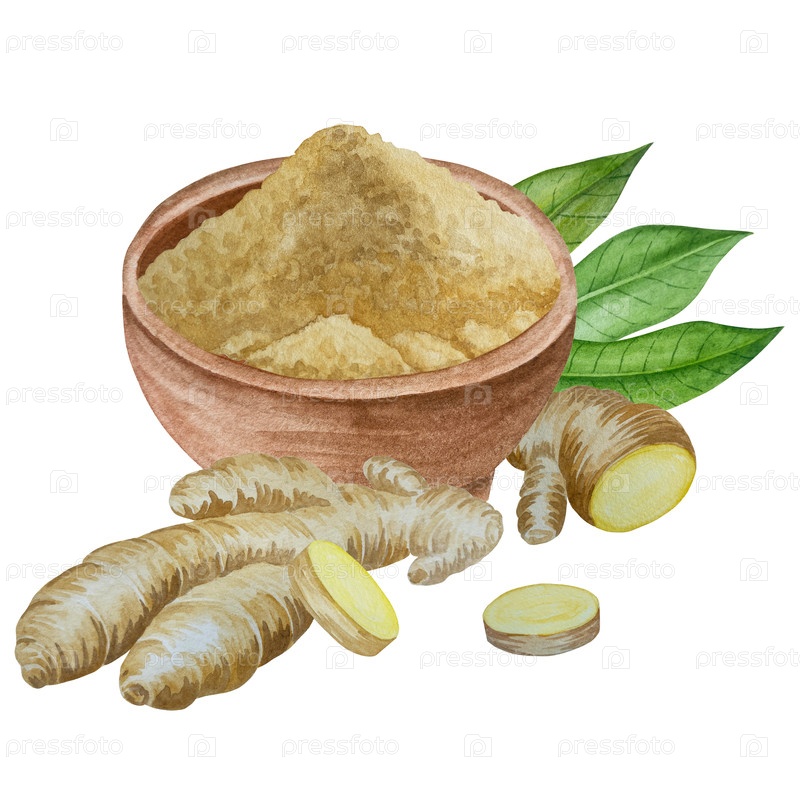 Акварельная иллюстрация пряностей имбиря, половины, листья и ломтики. Ручно нарисованная иллюстрация выделена на белом фоне. Корень имбиря для дизайна продуктов питания. Кухонная трава и специи