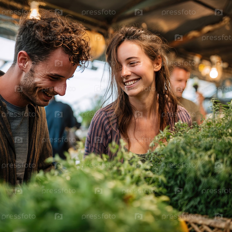 Улыбающаяся пара наслаждается свежими овощами на оживленном фермерском рынке с красочной продукцией