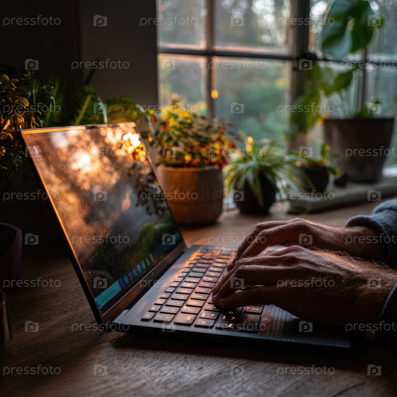 Руки печатаются на ноутбуке с теплым солнечным светом, фильтрующимся через окно в окружении растений
