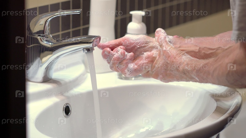 Концепция защиты организма от микробов и вирусов. Закройте руки пожилого человека, который наносит латунь и мыло для очистки микробов, бактерий. Защитите себя от инфекции