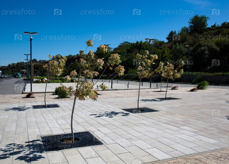 Зелёные насаждения среди каменной тропы на набережной Тамана летом