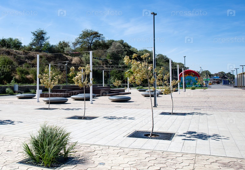 Зелёные насаждения среди каменной тропы на набережной Тамана летом