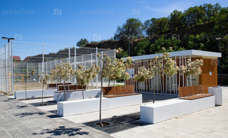 Зелёные насаждения среди каменной тропы на набережной Тамана летом