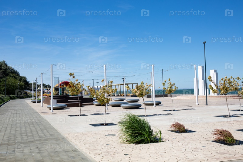 Зелёные насаждения среди каменной тропы на набережной Тамана летом