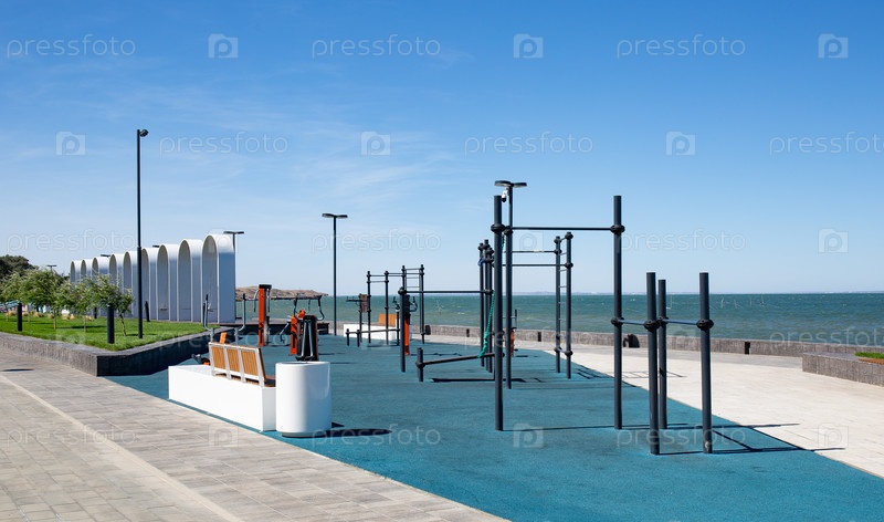Металлическая установка и гранитная дорожка на Таманской набережной летом