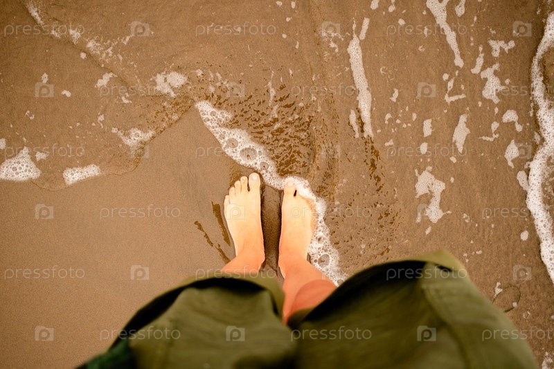 В воздушной перспективе босоногие женщины стоят там, где волны встречаются с песком.Идеально подходит для пляжного отдыха и темы свободы