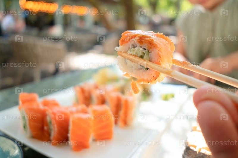 Аутентичный японский рулон суши с высококачественным лососем и огурцом, профессионально проведенный с помощью палочек в традиционной ресторанной обстановке