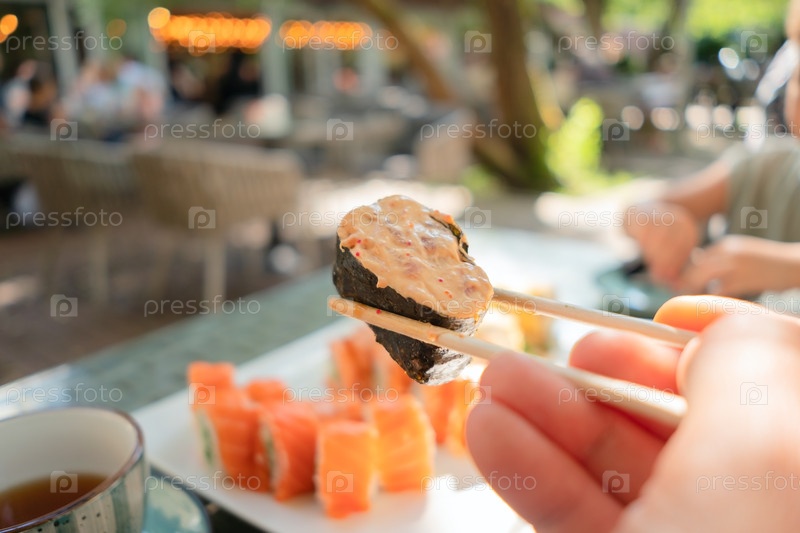 Близкий план суши из пряного лосося, завернутого в водоросли 'чука', выполняется палочками среди оживленного японского уличного ресторана
